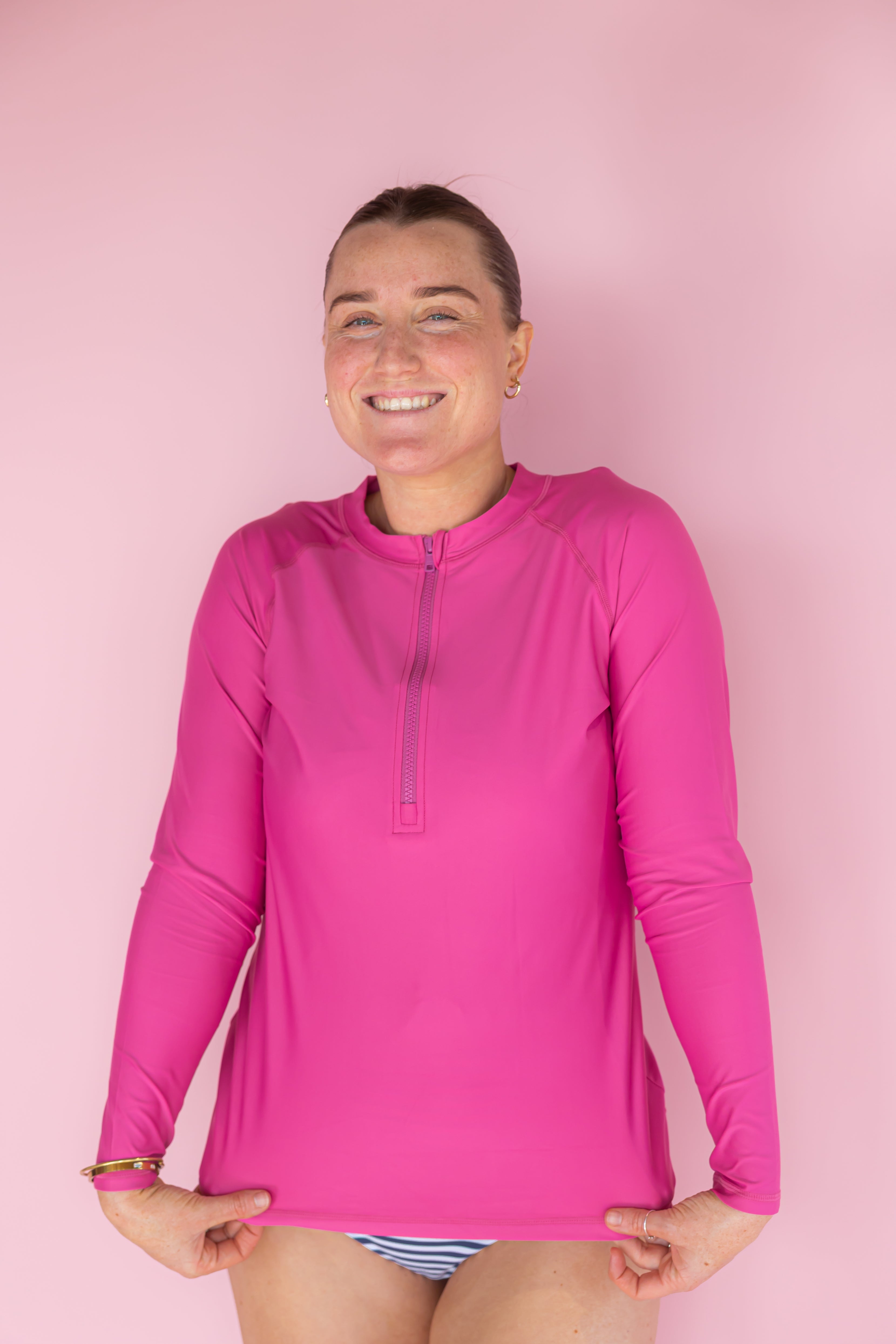 The Sun Kissed Rashie is your new best friend under the sun! Our swim rashie offers full-coverage protection with its long sleeves, shielding you from those harsh rays. Available in a dazzling array of fun colours and patterns, you’ll turn heads while staying safe. The stylish half zip not only adds a trendy touch but also makes it super easy to slip on and off. Perfect for wearing solo or under a wetsuit, the Sun Kissed Rashie ensures you’re ready for any water adventure. Stay sun-smart and stylish with the Sun Kissed Rashie – your go-to for when you're out in the sun all day (lucky thing!)