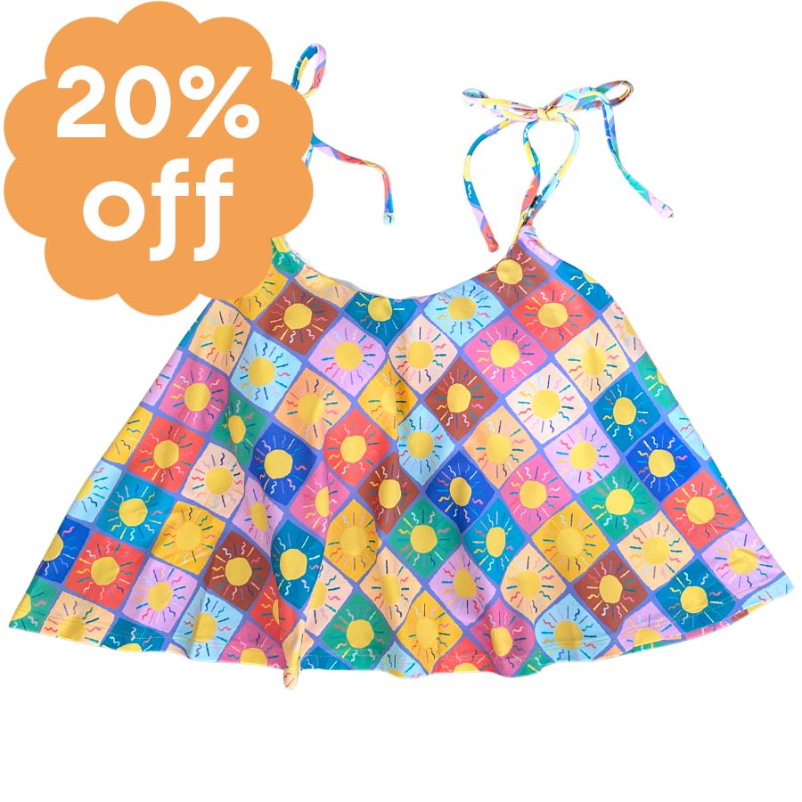 Frilly, flattering, feminine and fun: make a statement wearing our beautiful Swing Top! Comfort is key and you will find any excuse to wear this top - a super flattering shape for all body types. With thin, adjustable shoulder ties for the perfect fit and a deep scoop neckline, the hardest decision will be which bottom style to mix ‘n match this playful top with!